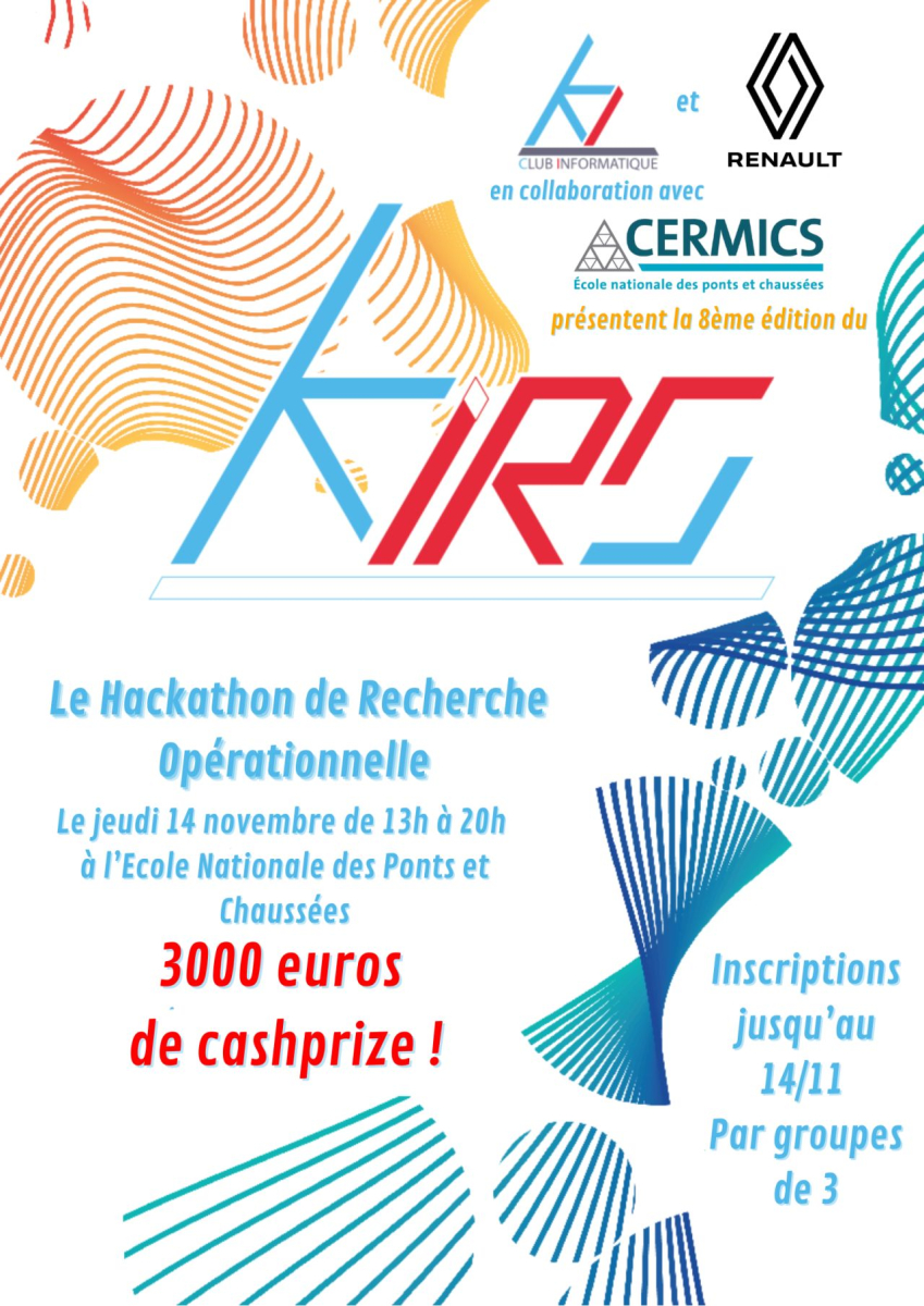 Le Club Informatique de l'École nationale des ponts et chaussées organise, avec le CERMICS, laboratoire de recherche en mathématiques appliquées, et en partenariat avec LA Fondation des Ponts et Renault,la 8ème édition du KIRO :
