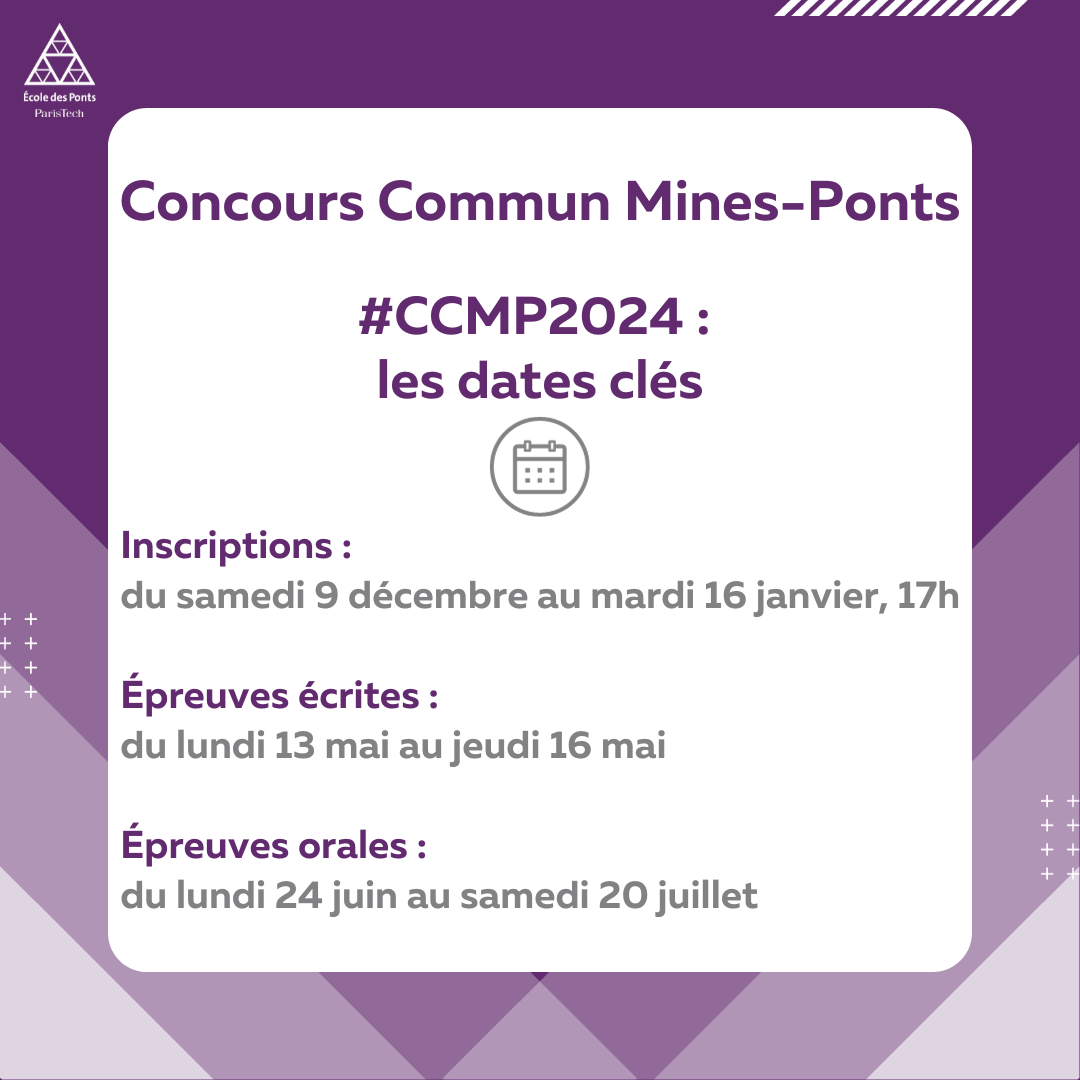 Les inscriptions au Concours Commun Mines-Ponts (CCMP) sont ouvertes du 9 décembre 2023 au 16 janvier 2024, 17h.