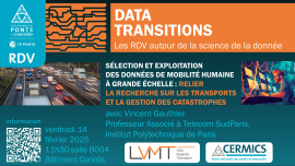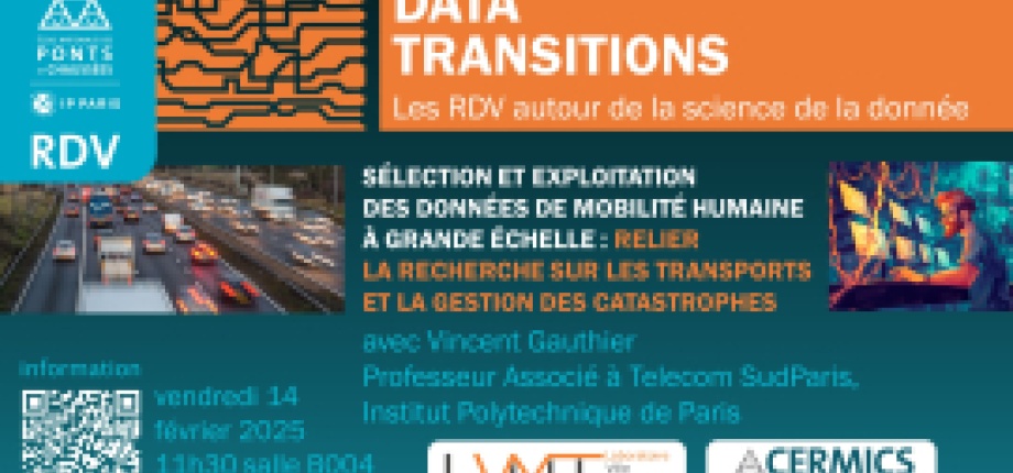 La prochaine séance des séminaires Data Transitions, organisés par le CERMICS et le LVMT, sur le thème "Sélection et l'exploitation des données de mobilité humaine à grande échelle : relier la recherche sur les transports et la gestion des catastrophes" se déroulera :