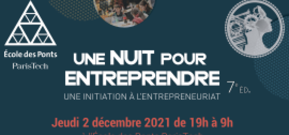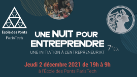 Après un an d'absence, l'École nationale des ponts et chaussées a le plaisir de lancer la 7ème édition d'Une Nuit Pour Entreprendre #1NPE2021 qui se tiendra du jeudi 2 décembre à 18h30 au vendredi 3 décembre 9h30 dans les murs de l'École. Cet événement invite les élèves ingénieurs à développer leur créativité et leur esprit d’entreprendre. Le principe est simple : en travaillant par petits groupes, les élèves ont une nuit pour élaborer un projet innovant. Ces projets sont soumis au petit matin à un jury composé de membres de l’École nationale des ponts et chaussées et d’entrepreneurs. Le 1er prix est remis par la Fondation des Ponts, les 2ème et 3ème prix par des entreprises partenaires. Cette initiation est ouverte aux étudiant-e-s de l'enseignement supérieur d'Ile-de-France.