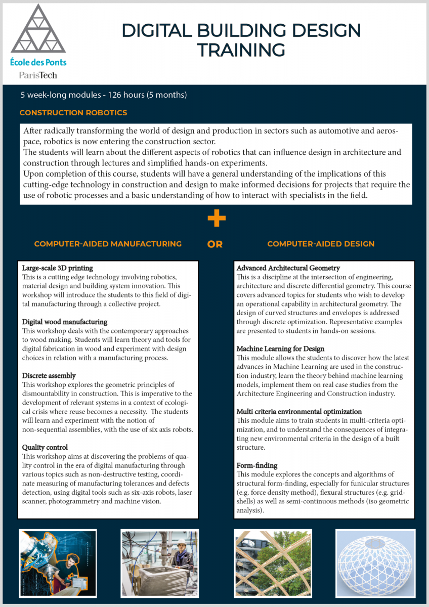 The DIGITAL BUILDING DESIGN Mastère Spécialisé® - Executive Master provides attendees with a cross-disciplinary culture of computational design and comprehensive knowledge of cutting-edge technologies in the fields of parametric architecture, advanced geometry, robotics and digital manufacturing for the construction industry. The program is designed for a selected group of architects, engineers, designers and digital artists and offering a variety of courses, fabrication and prototyping workshops, conferences, digital talks and networking events. It is a real opportunity to enter an international ecosystem of architectural innovation.