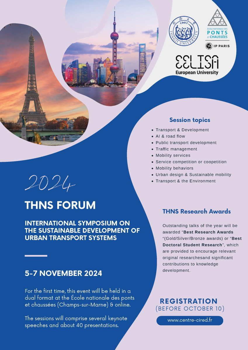 The THNS Forum is an International Symposium on the Sustainable Development of Urban Transport Systems, is organized by École nationale des ponts et chaussées and Tongji University. The Forum especially fosters the East-West exchange of knowledge advances: research outcomes, innovative technologies, implementation reports etc. It brings together academics, policy makers and business representatives (operators, constructors, consultants).