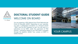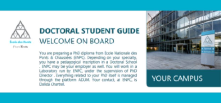 École nationale des ponts et chaussées Research Department launched the doctoral student welcome booklet, an interactive document that has been developed to make life easier for the School's doctoral students, from the initial contacts to start a thesis through to graduation.