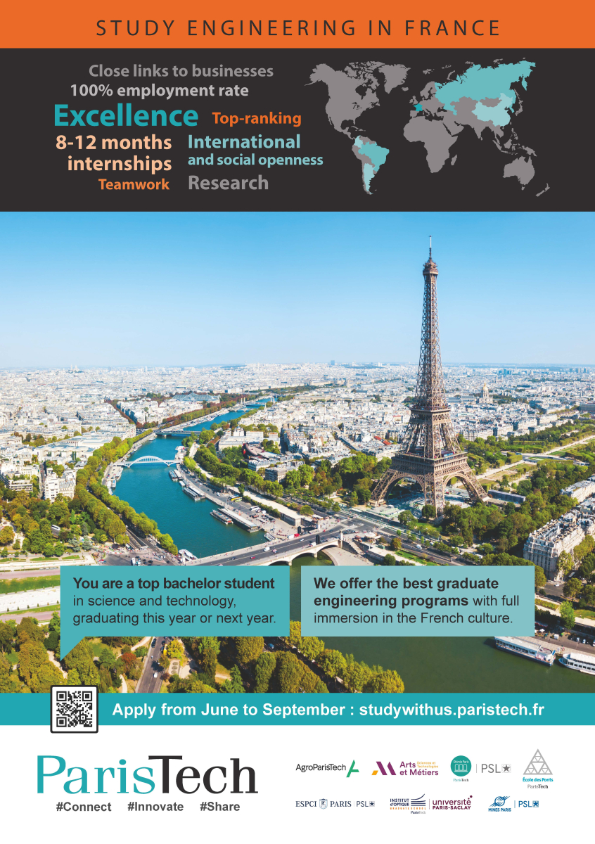 Moreover this program gives you the opportunity to apply not only for our school, but also for the six other ParisTech schools - AgroParisTech, Arts et Métiers, Chimie ParisTech - PSL, École nationale des ponts et chaussées, ESPCI Paris - PSL, Institut d'Optique, Mines Paris - PSL – that increase your chance to study in France. Indeed students submit a single application in which they in which they express their interest in one school or another, but retain all their chances of being admitted to one of the seven schools throughout the recruitment process.