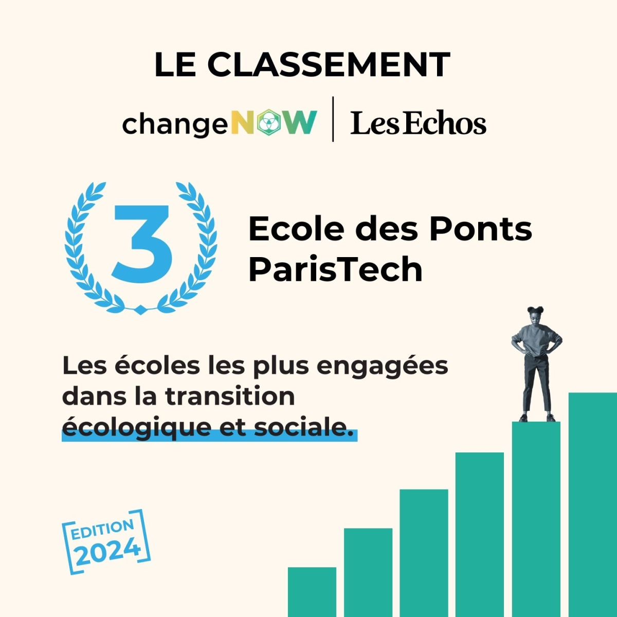 The 2024 ChangeNOW/Les Echos Ranking has just been published! For its 3rd participation, the École nationale des ponts et chaussées ranks 3rd among the engineering schools most committed to the ecological and social transition!