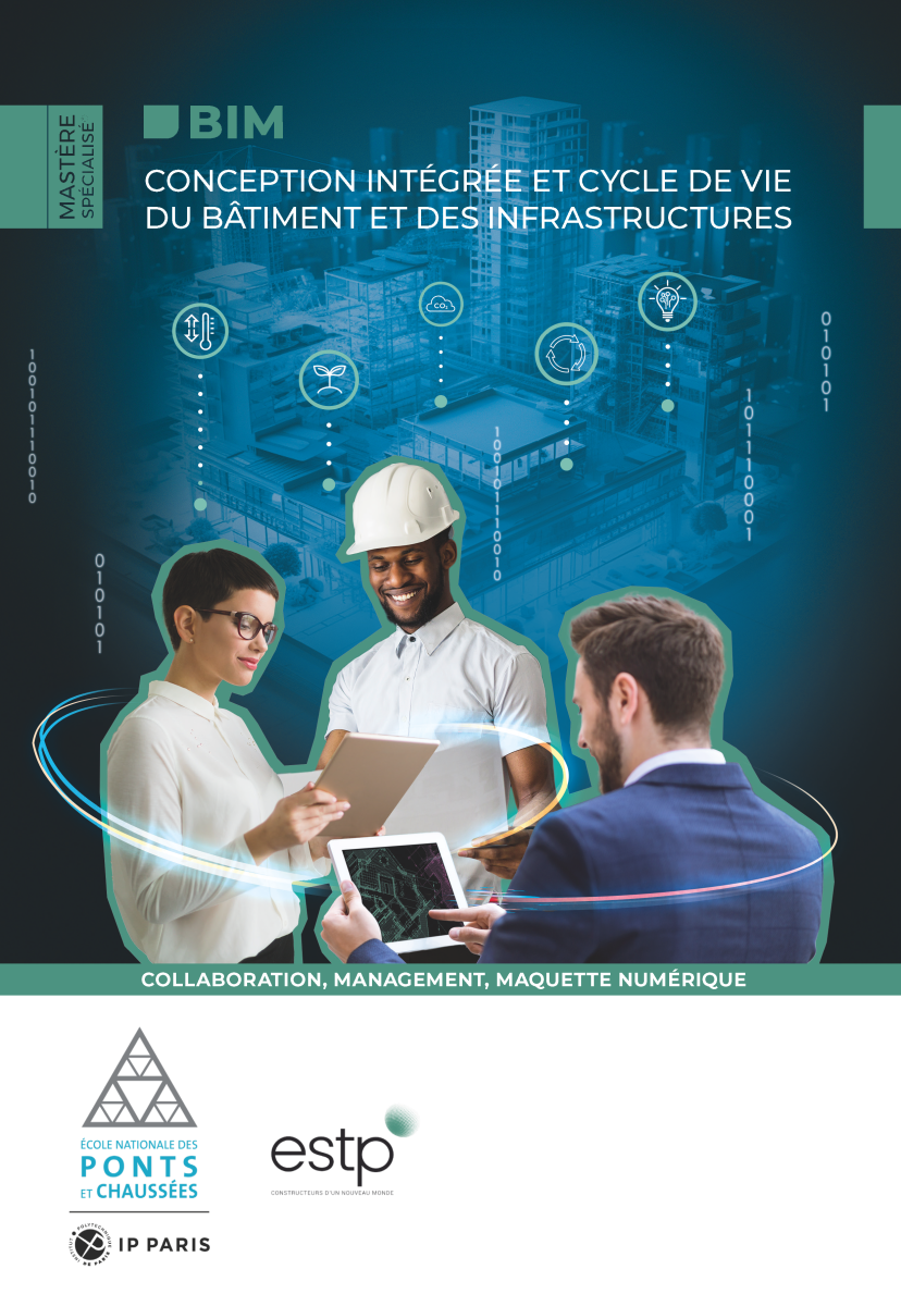 BIM, conception intégrée et cycle e vie du bâtiment et des infrastructures : À l’heure où le BIM commence à se généraliser dans les différents domaines et métiers de la construction, la formation de l’ensemble des acteurs du projet s’avère plus que jamais nécessaire. En réponse à cette nécessité, L’École nationale des ponts et chaussées et l'ESTP, proposent le Mastère Spécialisé BIM, créé en 2014 en association avec Arts et Métiers ParisTech, Géodata Paris (anciennement École Nationale des Sciences Géographiques), le Centre Scientifique et Technique du Bâtiment (CSTB), les écoles d’Architecture de Marseille, Toulouse et Paris Val-de-Seine et ECOTEC.