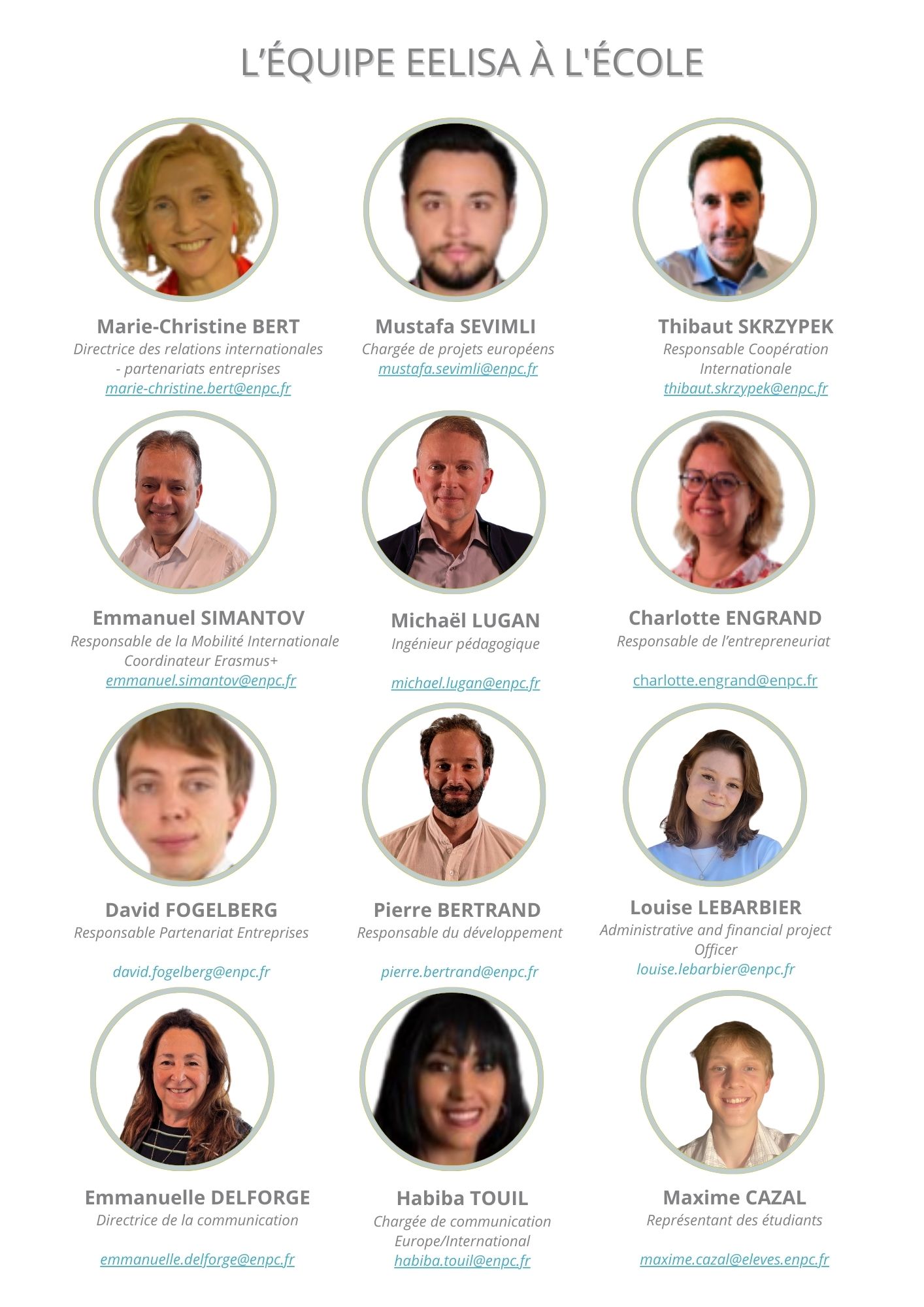 L'équipe EELISA à l'École est composée de 10 agents au sein du bureau local EELISA. Chaque membre du bureau local représente l’École au sein des groupes de travail d'EELISA destinés à l’exécution du plan de travail.